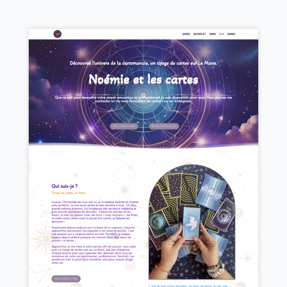 Création du site vitrine de Noémie, cartomancienne indépendante, afin de professionnaliser son activité, renforcer sa crédibilité en ligne et transformer sa visibilité sur les réseaux sociaux en demandes de prestations concrètes.