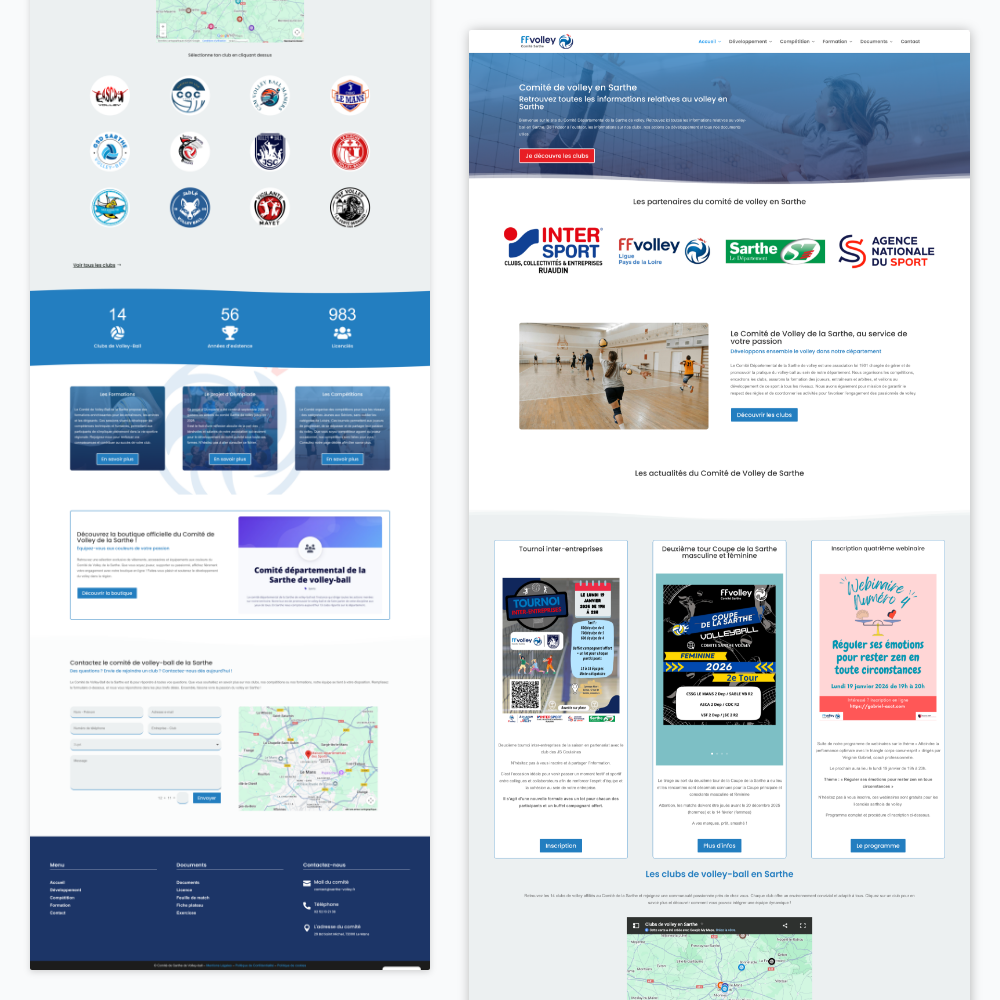La solution retenue a été une refonte complète, à la fois technique et visuelle. Migration vers un hébergement plus moderne et plus stable, reconstruction propre du site et création d’une maquette de page d’accueil afin de permettre au comité de se projeter avant le développement final. Le nouveau site offre une navigation claire, un accès centralisé à tous les documents nécessaires et une structure pensée pour durer. Au-delà de l’aspect technique, le site devient un véritable outil de communication pour le comité, contribuant à démocratiser davantage le volley en Sarthe. Les retours reçus à la livraison ont été très positifs, tant sur l’ergonomie que sur l’image renvoyée.